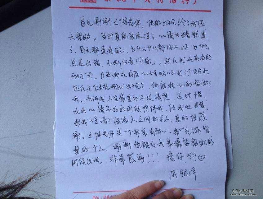 柒柒是(shì)一(yī)位80後的(de)年(nián)輕女(nǚ)孩,剛結婚不(bù)久就(jiù)碰上(shàng)了(le)感情上(shàng)的(de)困惑,于是(shì)☆找到(dào)了(le)樂(yuè)觀心理(lǐ)咨詢中心的(de)行(xíng)健老(lǎo)師(shī)。經過一(yī)番溝通(tōng)後案主在情緒和(hé)關系上♥(shàng)都(dōu)得(de)到(dào)了(le)改善,最近(jìn)案主柒柒告訴等分(fēn)老(lǎo)師(shī)¶說(shuō):“現(xiàn)在她(tā)知(zhī)道(dào)如(rú)何愛(ài)自(zì)己了(le),和(hé)自(zì)己在一(yī)起的(de)時(shí)候感覺很(h←ěn)快(kuài)樂(yuè),和(hé)老(lǎo)公和(hé)婆婆的(de)關系都(dōu)得(de)到(dào)了(le)改善。 樂(yuè)觀心理(lǐ)咨詢中心很(hěn)高(gāo)興我們的(de)案主能(néng)夠在生(shēng)活中得(de)到(dào)改變,行(xíng)健老(lǎo)師(shī)也<(yě)十分(fēn)感恩大(dà)家(jiā)對(duì)于樂(yuè)觀心理(lǐ)咨詢中心的(de)支持和(héσ)信任。 附感謝(xiè)信 ![]() 感恩所有(yǒu)患者選擇來(lái)到(dào)樂(yuè)觀心理(lǐ)咨詢中心進行(xí↑ng)治療,感恩你(nǐ)們為(wèi)我們創造的(de)财富,也(yě)很(hěn)欣慰你(nǐ)們在樂(yuè)觀的(d♠e)療程心理(lǐ)輔導中掌握及擁有(yǒu)了(le)極大(dà)的(de)精神财富。 樂(yuè)觀心理(lǐ)小(xiǎo)編感恩你(nǐ)們,祝福你(nǐ)們早©日(rì)走出恐懼症的(de)泥潭,找到(dào)自(zì)己幸福的(de)源頭。小(xiǎo)編愛(ài)你(nǐ)們!恐懼症患者們,當你(n"ǐ)無法自(zì)救的(de)時(shí)候,選擇一(yī)個(gè)合适的(de)心理(lǐ)咨詢師(shī)做(zuò) 生(shēng)命的(de)領路(lù)人(rénσ),這(zhè)也(yě)是(shì)很(hěn)明(míng)智的(de)選擇!懂(dǒng)得(de)求救,說(shuō)明(míng)你(nǐ)對(duì)自(zì)我δ完善有(yǒu)強烈的(de)意圖和(hé)欲望,這(zhè)也(yě)是(shì)一(yī)種能(néng)力哦!強迫症人Ω(rén)都(dōu)太不(bù)懂(dǒng)珍惜自(zì)己、愛(ài)自(zì)己,請(qǐng)從(cóng)懂(dǒng)得(de)求救 開(kāi)始,好(hǎo)好≤(hǎo)的(de)愛(ài)自(zì)己,學習(xí)生(shēng)活的(de)智慧、社會(huì)的(de)規則、心理(lǐ)的(de)規律,請(qǐng)患者們為(wèi)你(nǐ)們自(zì)己做(zuò)最好(hǎo)的(de)選擇哦!樂(yuè)觀心理(lǐ)互助QQ群:310947830 線上(shàng)會(huì)有(yǒu)心理(lǐ)咨詢師(shī)答(dá)疑